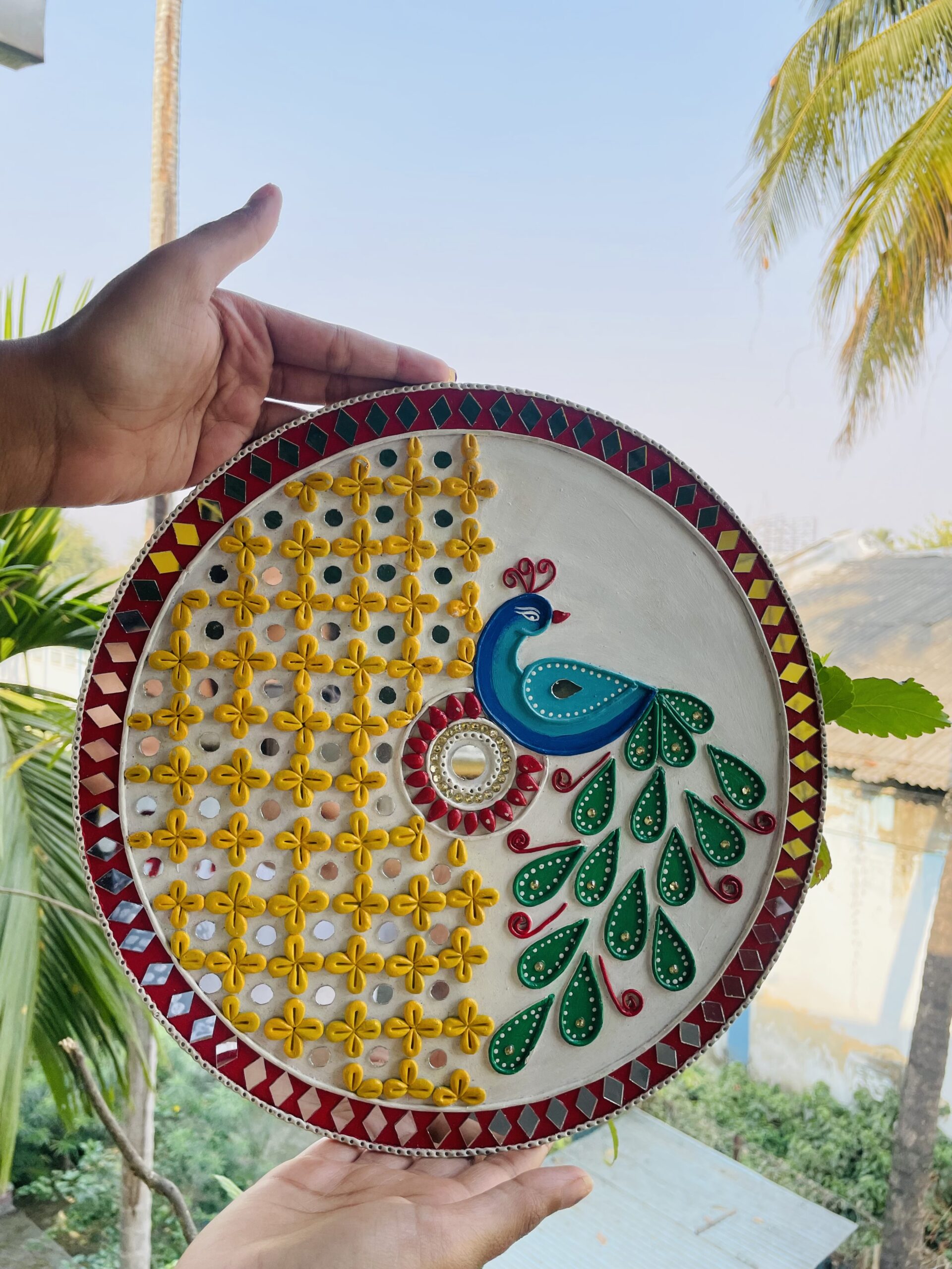 Applying a base layer of clay to walls or other surfaces is the first step in making Lippan art. One of the main characteristics of Lippan art is the use of mirror work to add tiny details after the clay has been sculpted into different designs. Mirrors of various sizes and shapes are incorporated into the clay to produce a stunning appearance that reflects light and has a captivating visual appeal. Vibrant hues like reds, blues, and yellows are frequently added to the completed sculpture to make it stand out as a focal point in any space. Handmade Lippan art items are highly prized because of the talent and accuracy required for this complex procedure.